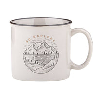Stay cozy and cuddle up with a campfire mug · Added gold metallic accents · New Grey Finish · Phrase reads: Go Explore · A portion of all proceeds will be donated to build Wells in Uganda · Material: Ceramic · Size: 3.5" H / 13 oz · Care Instructions: Hand Wash Only - Do Not Microwave
