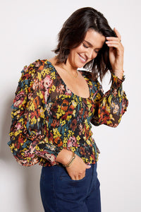 Make a stylish statement with this gorgeous floral top by Cleobella. Crafted in crinkle chiffon fabric, this fun and feminine blouse features a flattering smocked bodice, scoop neckline, and voluminous puff sleeves with ruffle details. Pair with everything from jeans to a vegan leather skirt.