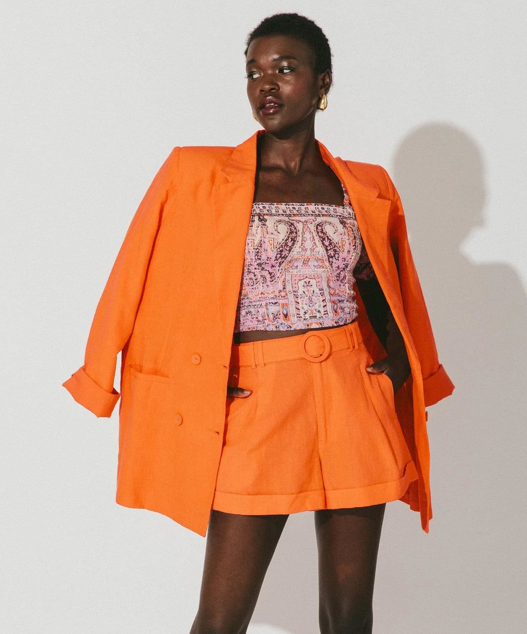 In a cotton linen blend, the Oscar Short is the perfect bright short to add to your sustainable wardrobe. A removable double o-ring belt graces the waist. Pair with the Prescott Jacket to complete the look.