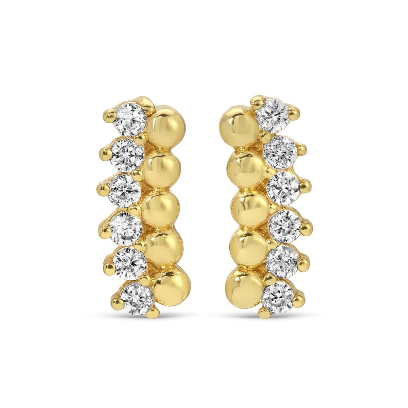 Looking for a classic and polished pair of studs? Check out our Delicate Dots CZ Studs! These studs are simple, but elevate any look. 1" x 1.9" Velvet Tag .5" x .9" Studs 18k Gold Plated Brass Base Cubic Zirconia
