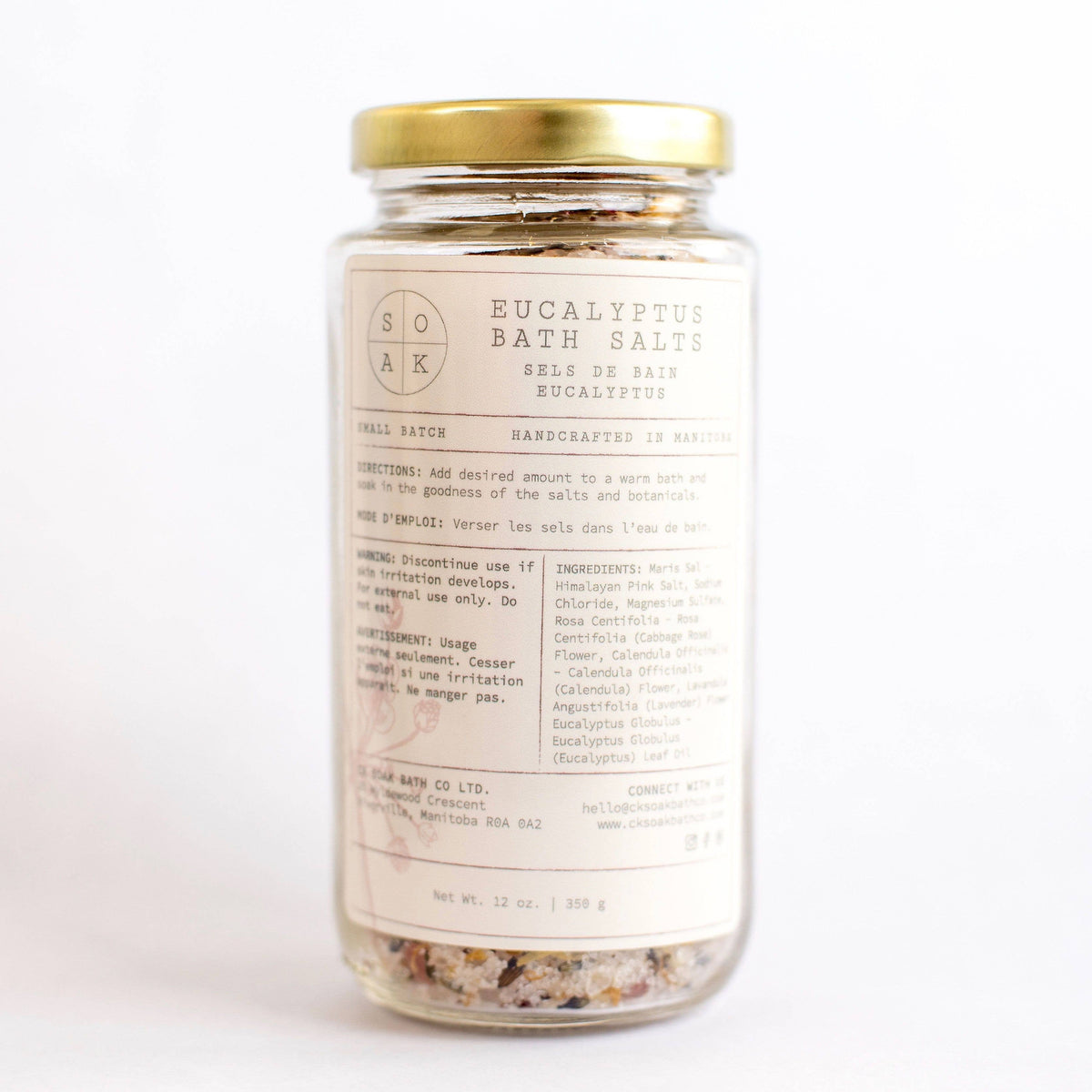 Sprinkle these spa-like salts into the tub at the end of a long day or indulge in a spa day at home. Naturally infused with Eucalyptus essential oil, this blend is going to transport you to the spa in the comfort of your own home. Botanicals of rose petal, lavender buds and calendula petals will float on top of the water to make you feel like the goddess you are. The perfect gift for the holidays, Mother's Day and Valentine's Day. Recommended for those who like to create self care experiences at home. Use the Eucalyptus Bath Salt soak in the bath or to create a beautiful foot soak at the end of along day. SOAK Bath Co is a woman owned brand based in Manitoba, Canada. Each of our products is handmade by our local team of women in our Canadian studio with all natural, vegan-friendly ingredients. We believe in creating sustainable products that make the best gifts and you feel great using on your skin. The best part, you can plant our soap labels and they'll grow into wildflowers!