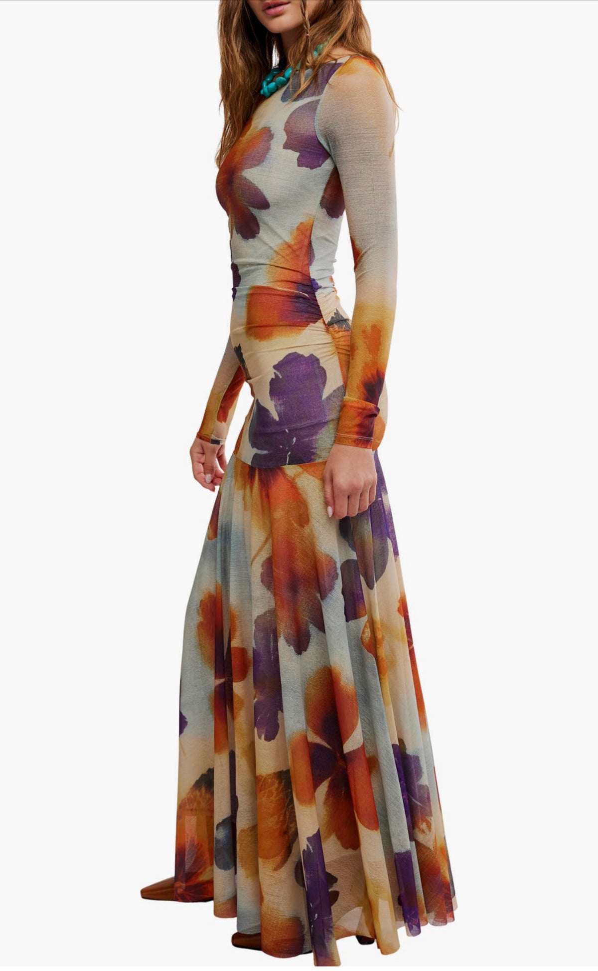 A bold, vibrant pattern takes center stage on a long-sleeve mesh dress that's a contemporary style standout.