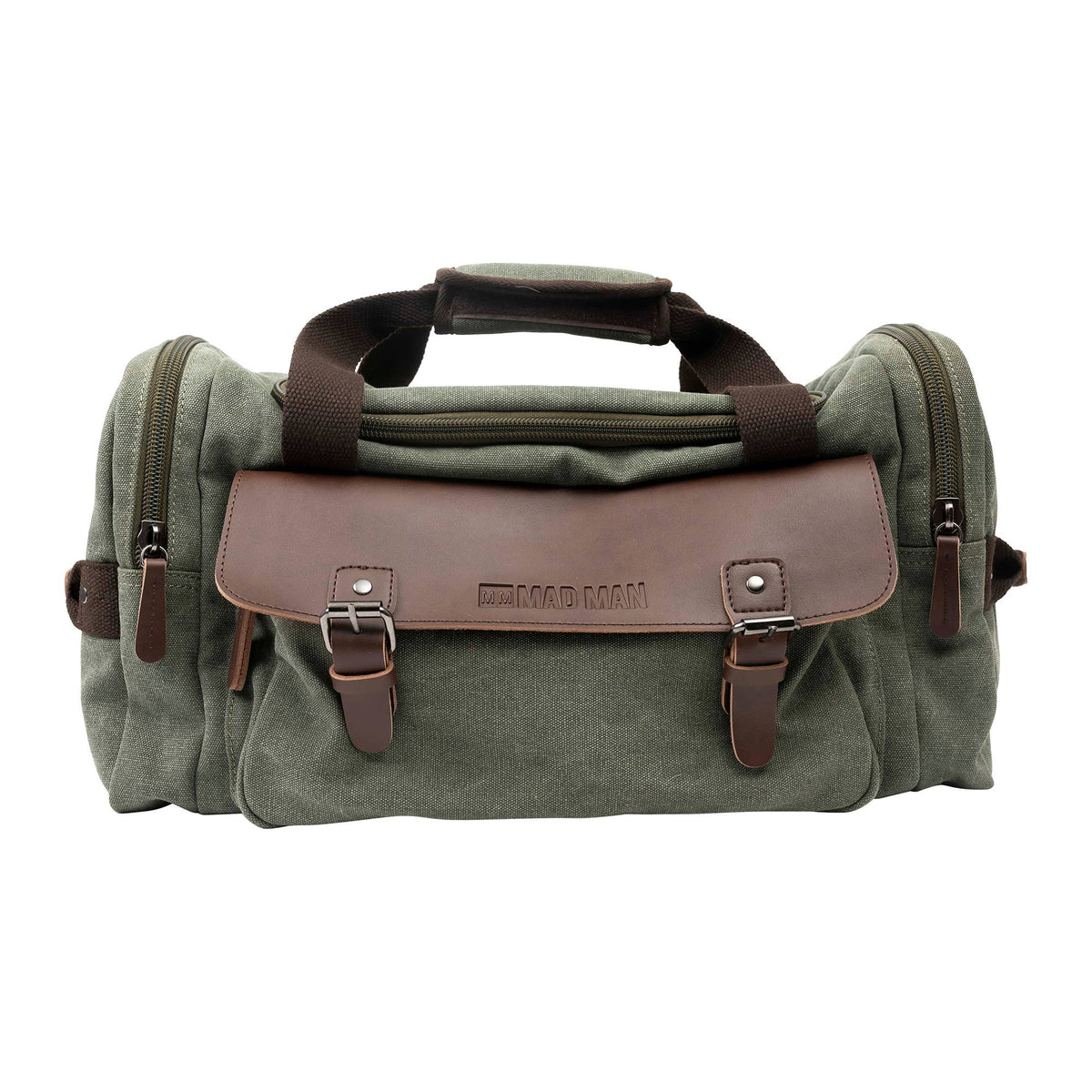 The Jet Setter Duffle by Mad Man is the ultimate travel companion for those who live life on the fly! Crafted from heavy canvas with luxurious faux leather detailing, this duffle bag is not just luggage – it's a statement piece for the modern explorer. • Keep your belongings in order with multiple pockets, including front and back zippered pockets and two large zippered side pockets.  • The spacious main compartment features organizer pockets to keep your essentials neat and accessible.  • Carry it with ease using the shoulder strap with adjustable pad, or grab it by the grip handles.  • Raised feet keep your duffle off the ground, protecting it from wear and tear. Whether you're gearing up for a weekend retreat or a cross-country trek, this duffle has everything you need to travel in comfort and class.