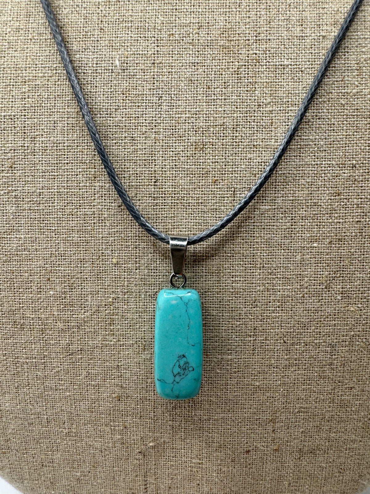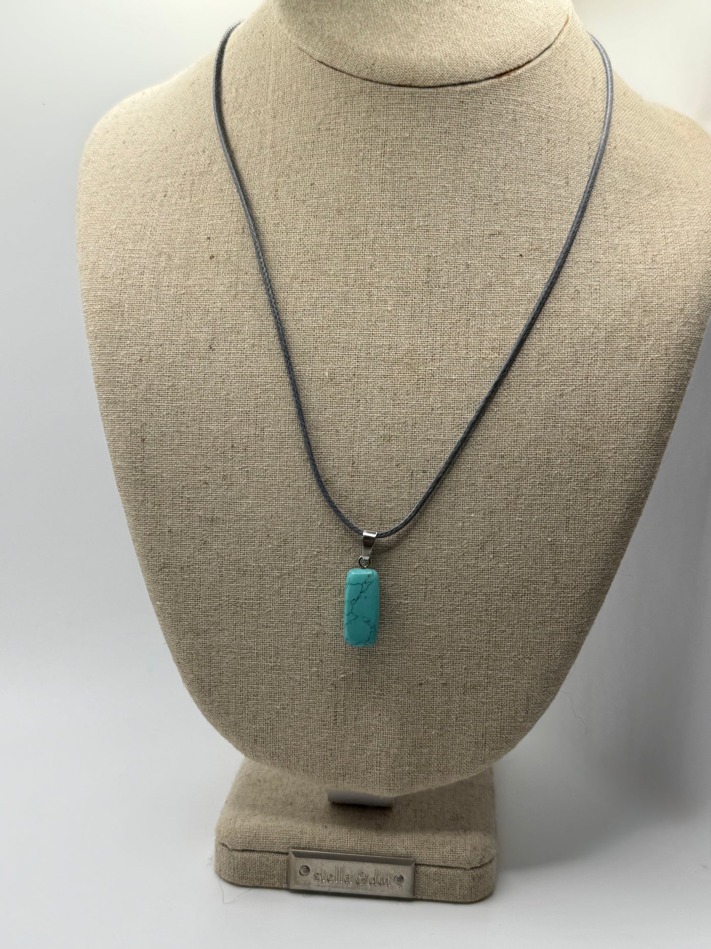 A modern statement with a clean edge. This turquoise bar pendant necklace features a smooth rectangular stone suspended from a braided charcoal cord, creating a striking contrast of color and texture. The minimal silhouette keeps it refined while the bold stone adds just enough presence.