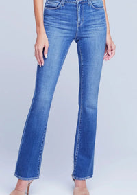 A flattering straight-leg high-rise jean in medium-blue premium stretch denim with subtle whiskering and meticulous sanding on hip and thigh. Contoured waistband fits securely around the natural waist as it smooths and slims, while the premium stretch denim hugs hip, thigh, and knee before releasing into a sleek straight leg. With classic five-pocket construction and zip fly closure.