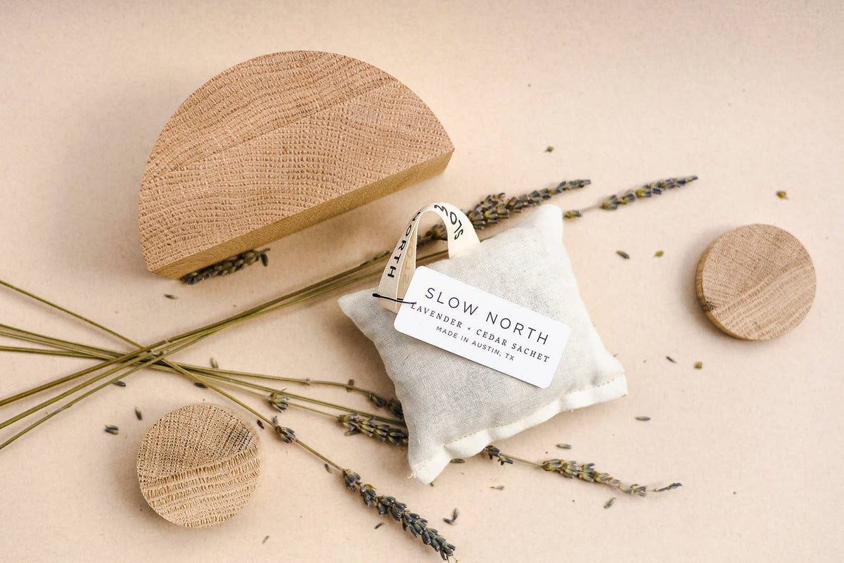 Add a scent to your clothing drawers and shoes with a sachet pouch. Each pouch is filled with a relaxing and grounding blend of lavender and cedar. Each pouch comes with a loop for hanging throughout the home or in a car. Gently squeeze your pouch to reactivate the aromatherapy at any time. Care Instructions: Hang in a cool dry place taking care not to get wet. Spot clean. Approximately 4in x 3in Made by the Slow North Team in Austin, Texas.