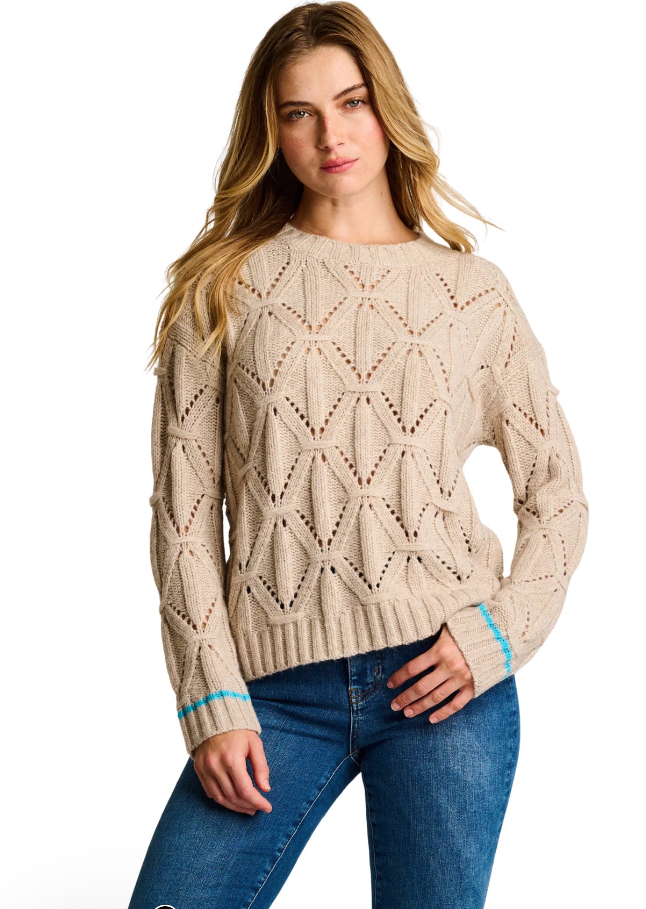 Expertly crafted for both style and comfort, the LISA TODD Cable Crew Oatmeal sweater features a timeless cable knit design with a vibrant electric blue sleeve detail. Made with premium materials, this sweater is sure to keep you warm and add a pop of color to your wardrobe.