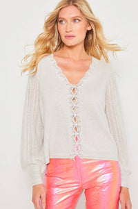 Love is in the details on this one. Lacey Lover is a delicate petite button-front reversible Cashmere cardigan, featuring a lace neckline with volume through the pointelle stitch bell sleeves.
