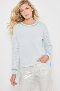 The Stitchy Situation luxury Cotton sweater is a light and cozy knit brimming with refined details. This classic crew neck silhouette features pointelle sleeves, a seed stitch body, and contrast trims at the neckline and cuffs.