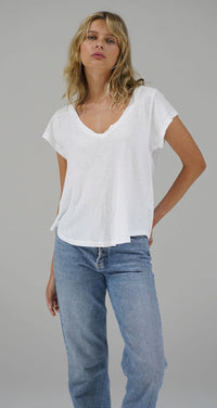 The Kaden is a loose fitting deep v neck tee. A slightly rounded hemline and cap sleeves make this a perfectly relaxed fitting top to pair with denim.