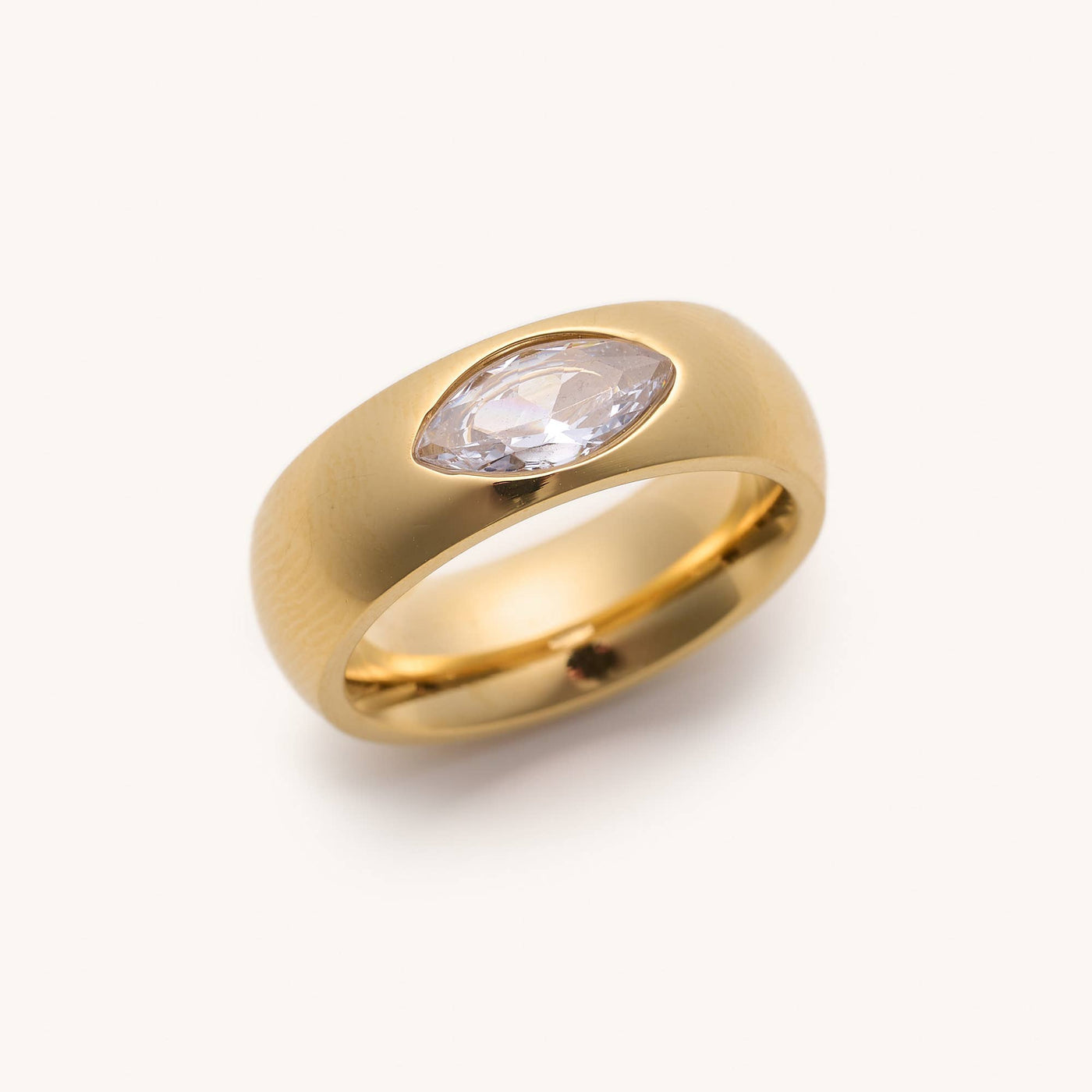 * Waterproof Gold: Stainless steel and 14k gold * Cubic zirconia gem * Available in sizes 5-9