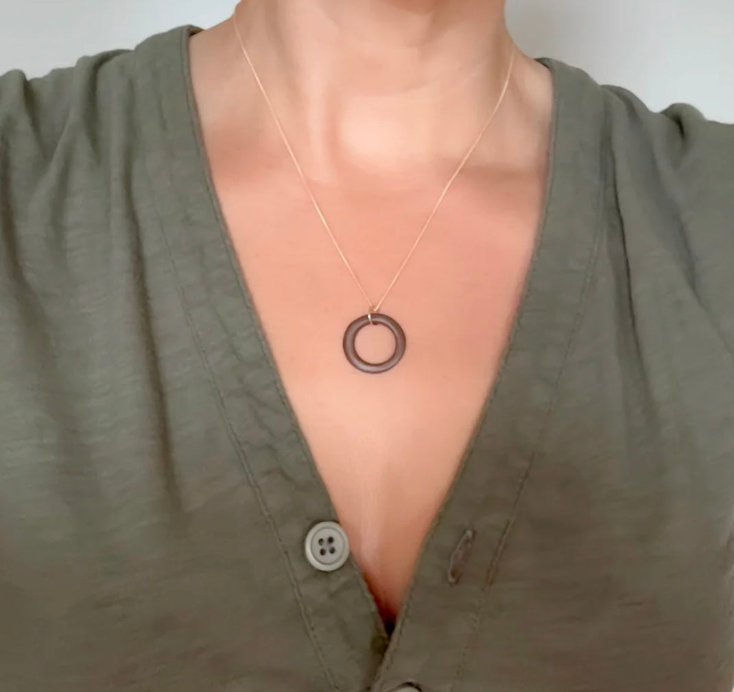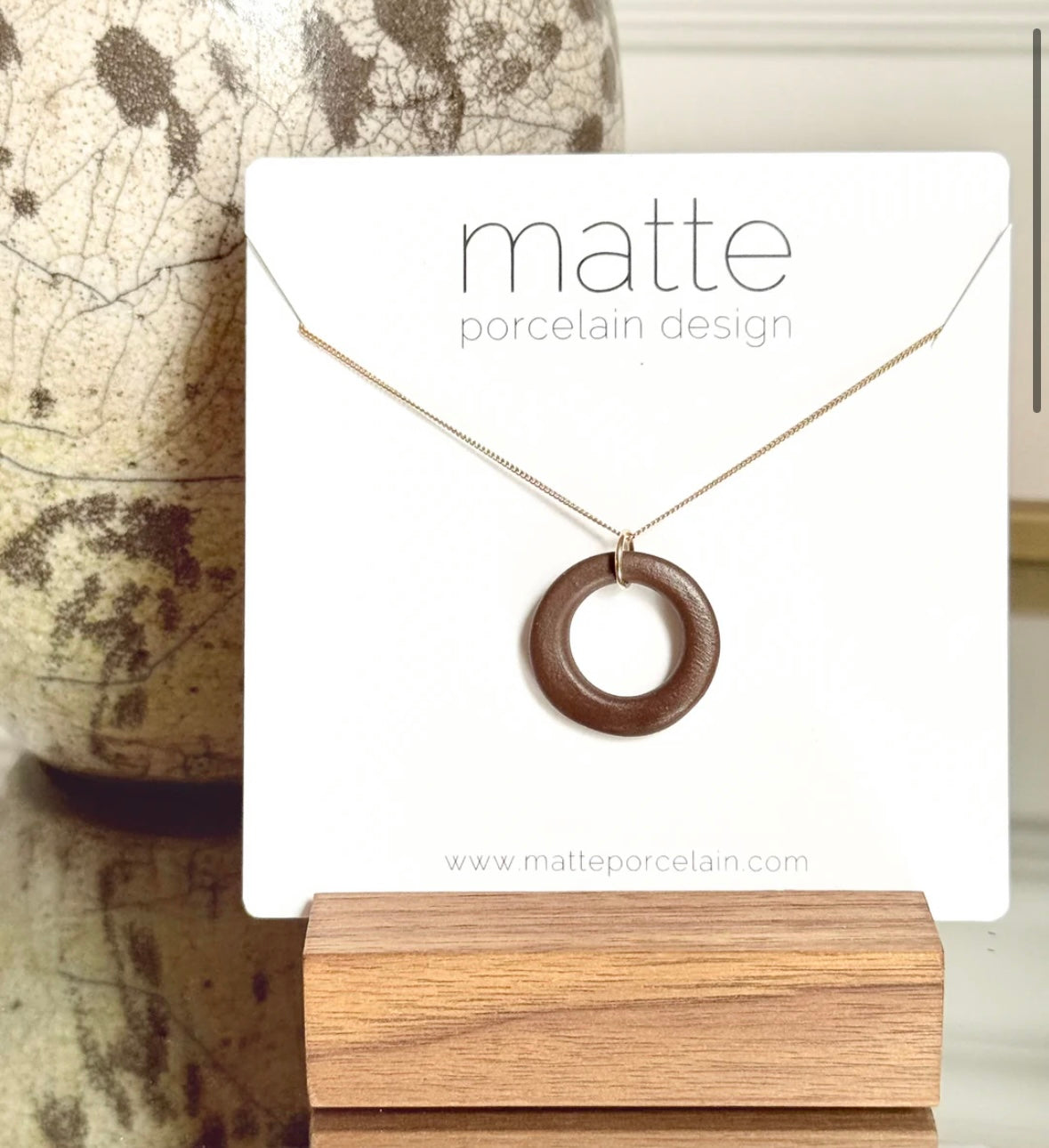 Sleek yet organic, the MINI LOOP necklace highlights a single sculpted ceramic circle suspended on a delicate gold-filled chain. Its minimalist form makes it endlessly versatile, worn alone or layered with other matte pieces. For a coordinated look, style it with the MINI LOOP drops.