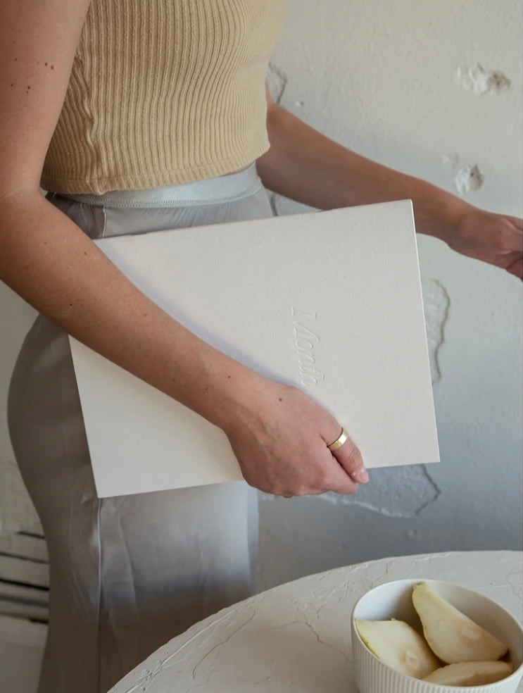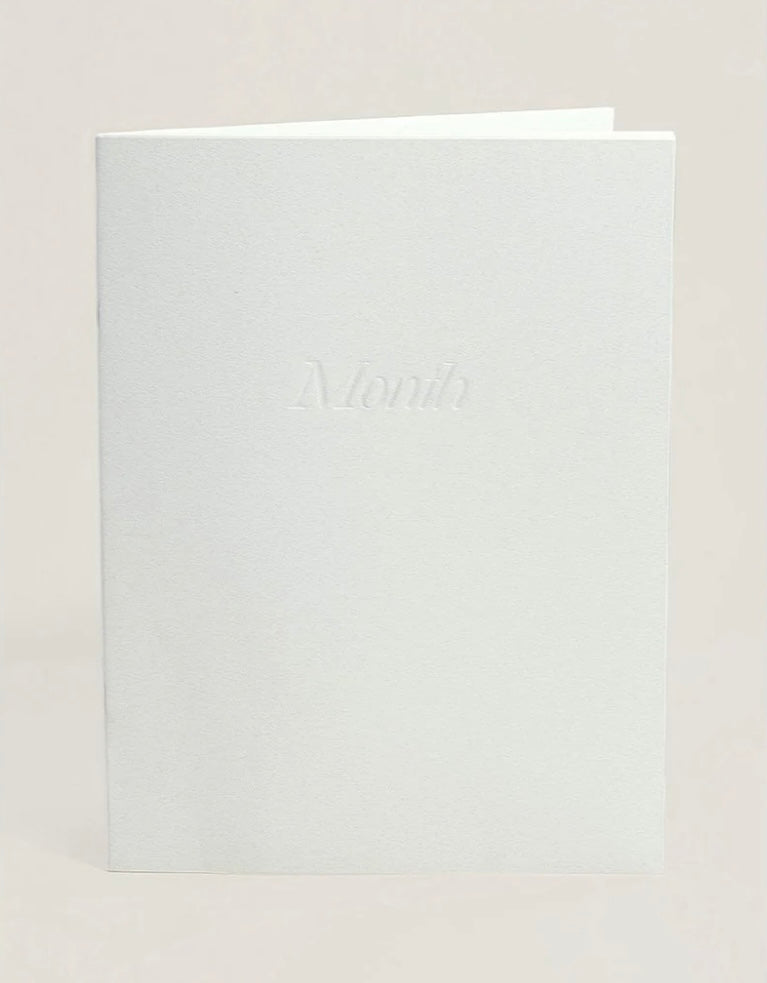Blind letterpress cover printed on luxe recycled stock in chalk.