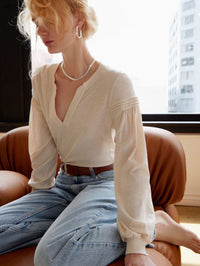 If wandering cobblestone streets on an Italian vacation was a shirt, this would be it. Subtle balloon sleeves with ribbed cuffs, pintuck details, and a ribbed, sliced neckline. Perfectly easy, perfectly undone. Pair with your favorite denim. (This one comes in Parchment.)