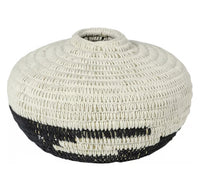 Urn features hand-wrapped white and black cotton over a natural seagrass frame.