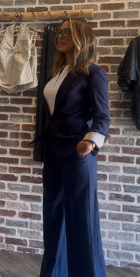 Soft structure meets lived-in texture in the Cyrus Blazer, cut from brushed Japanese pinstripe. Pair it with the matching Hepburn Pant or Selena Skirt for a full set, or dress it down with denim for contrast.