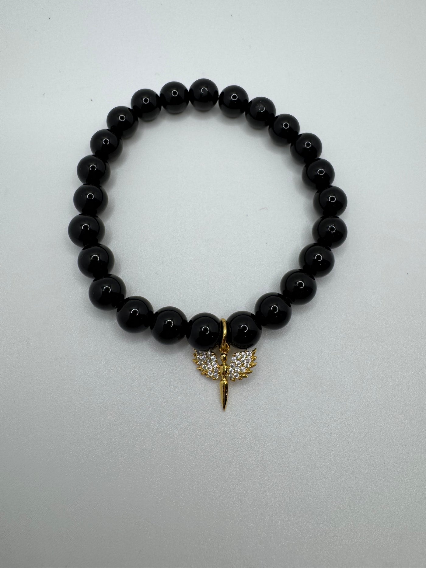 Sleek black onyx beads meet a delicate gold angel wing charm encrusted with shimmering stones. A modern take on a protective symbol, this bracelet blends darkness and light for a look that feels powerful, intentional, and elevated.