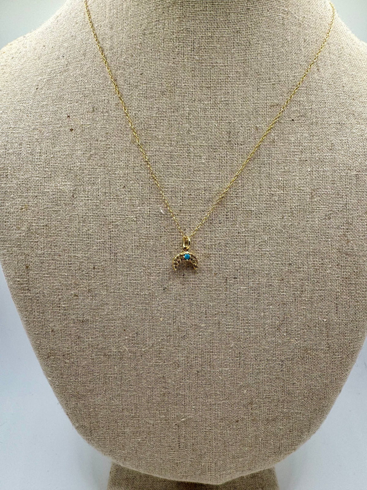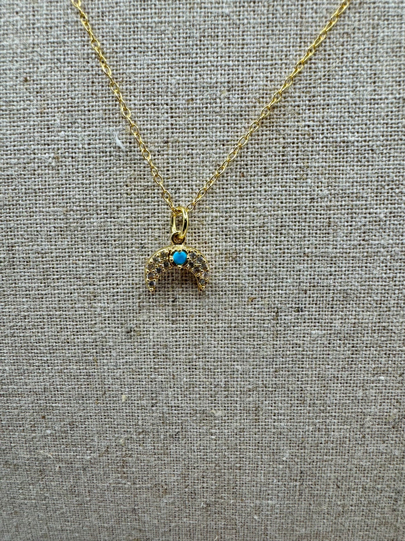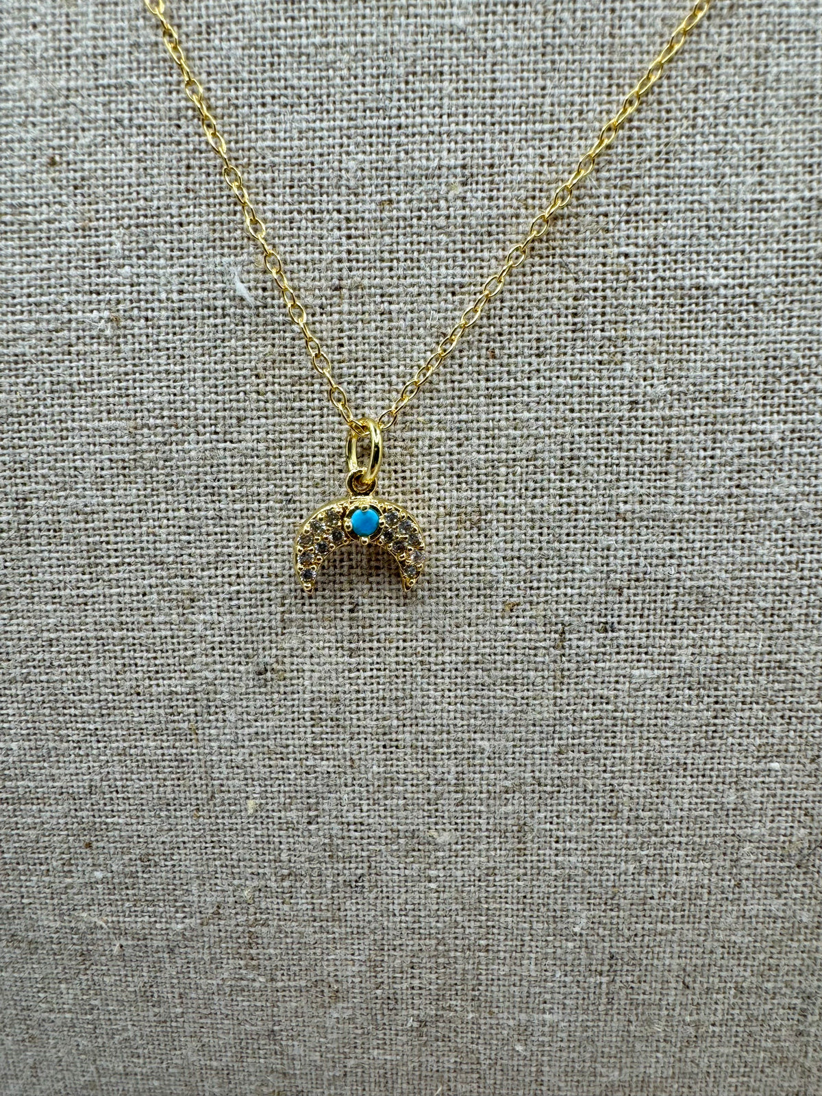 A delicate gold crescent charm accented with a vibrant turquoise center and subtle crystal detailing. This celestial-inspired piece adds a touch of color and quiet sparkle while remaining effortlessly wearable. Designed on a fine gold chain, it’s perfect for everyday layering or worn alone as a meaningful, understated statement.