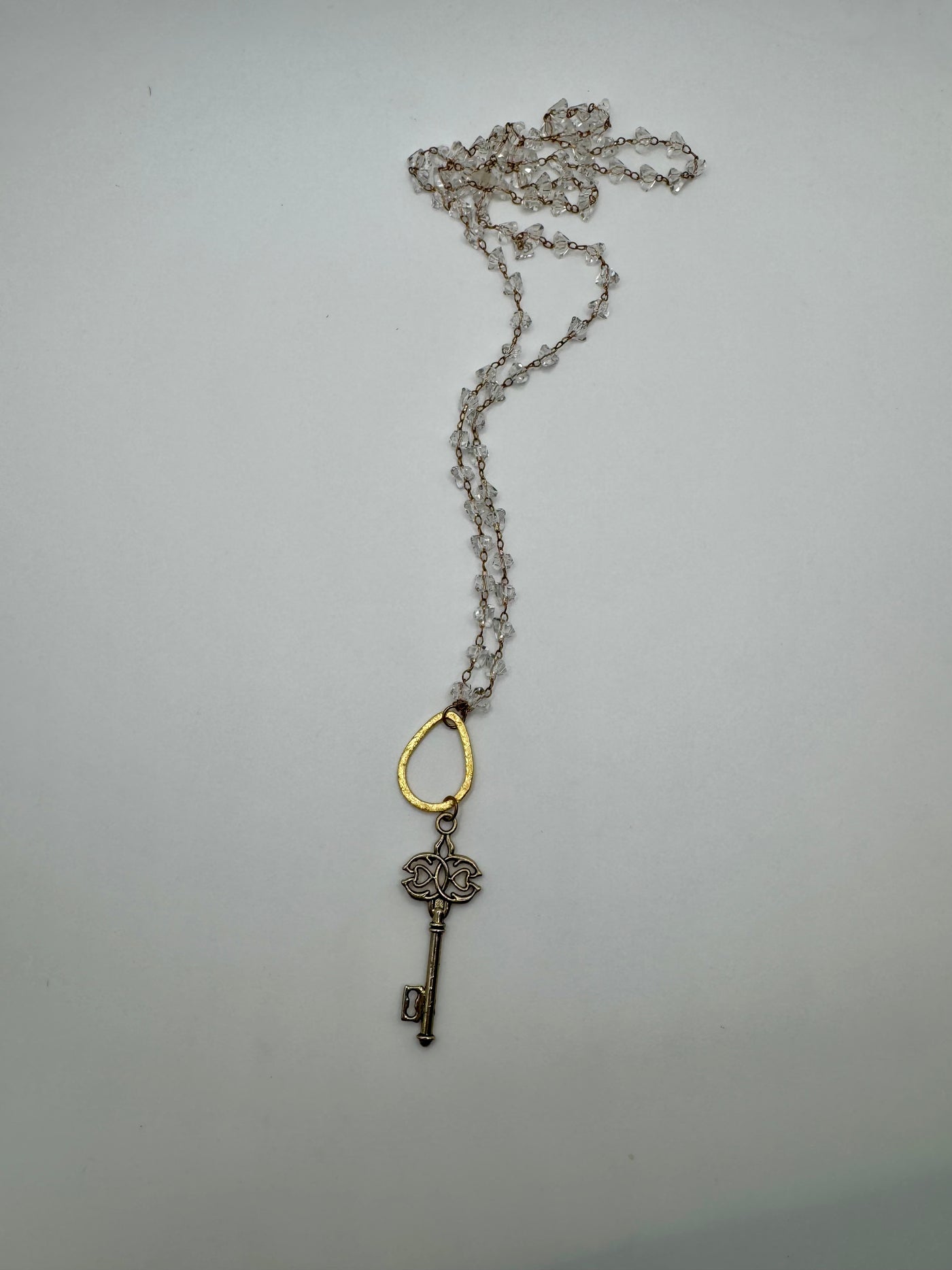 A long, delicate chain of faceted clear crystals finished with an antique-inspired key charm and textured gold accent. Designed to symbolize new beginnings and inner clarity, this 28-inch necklace drapes beautifully for an ethereal, layered look.