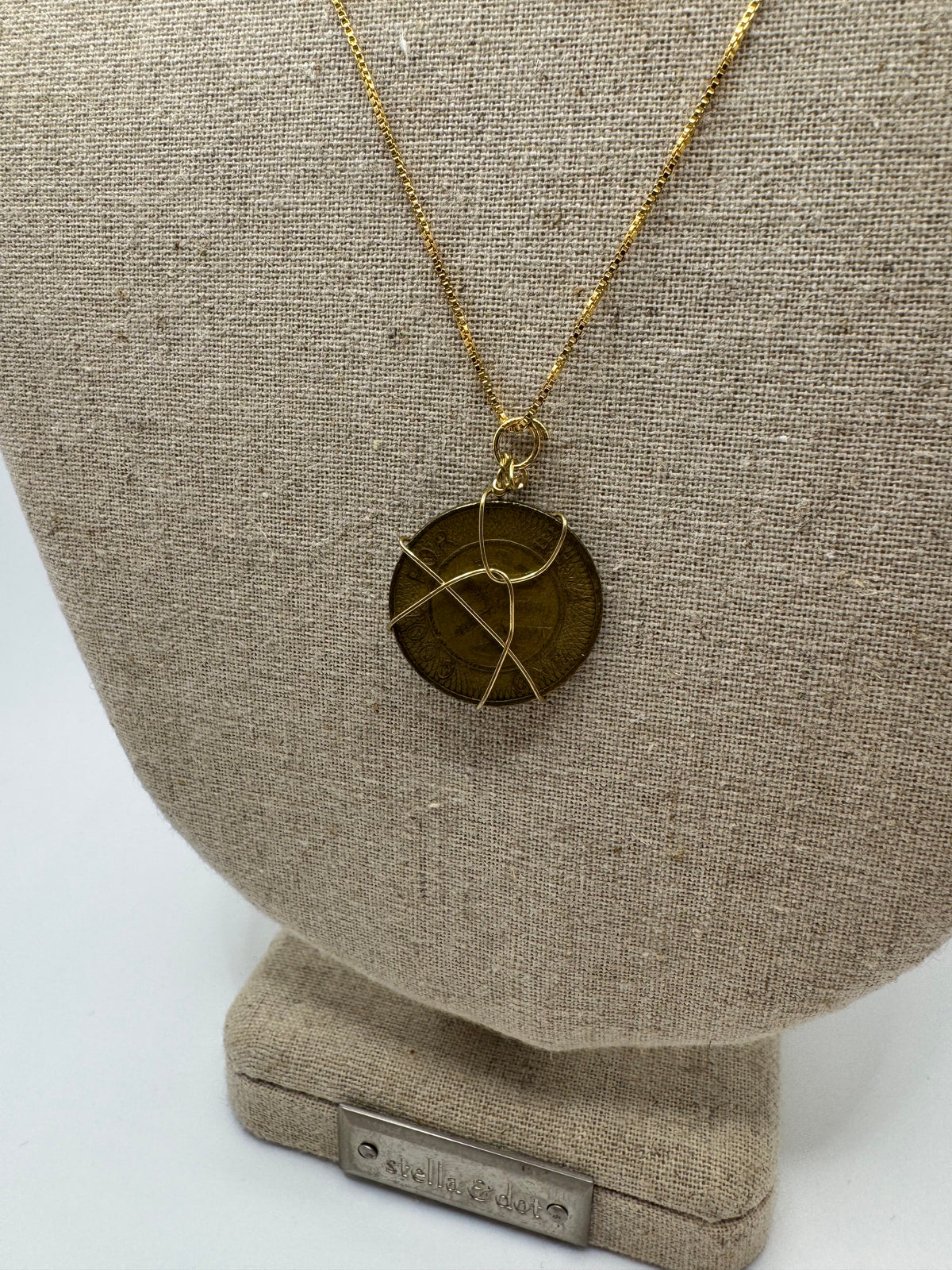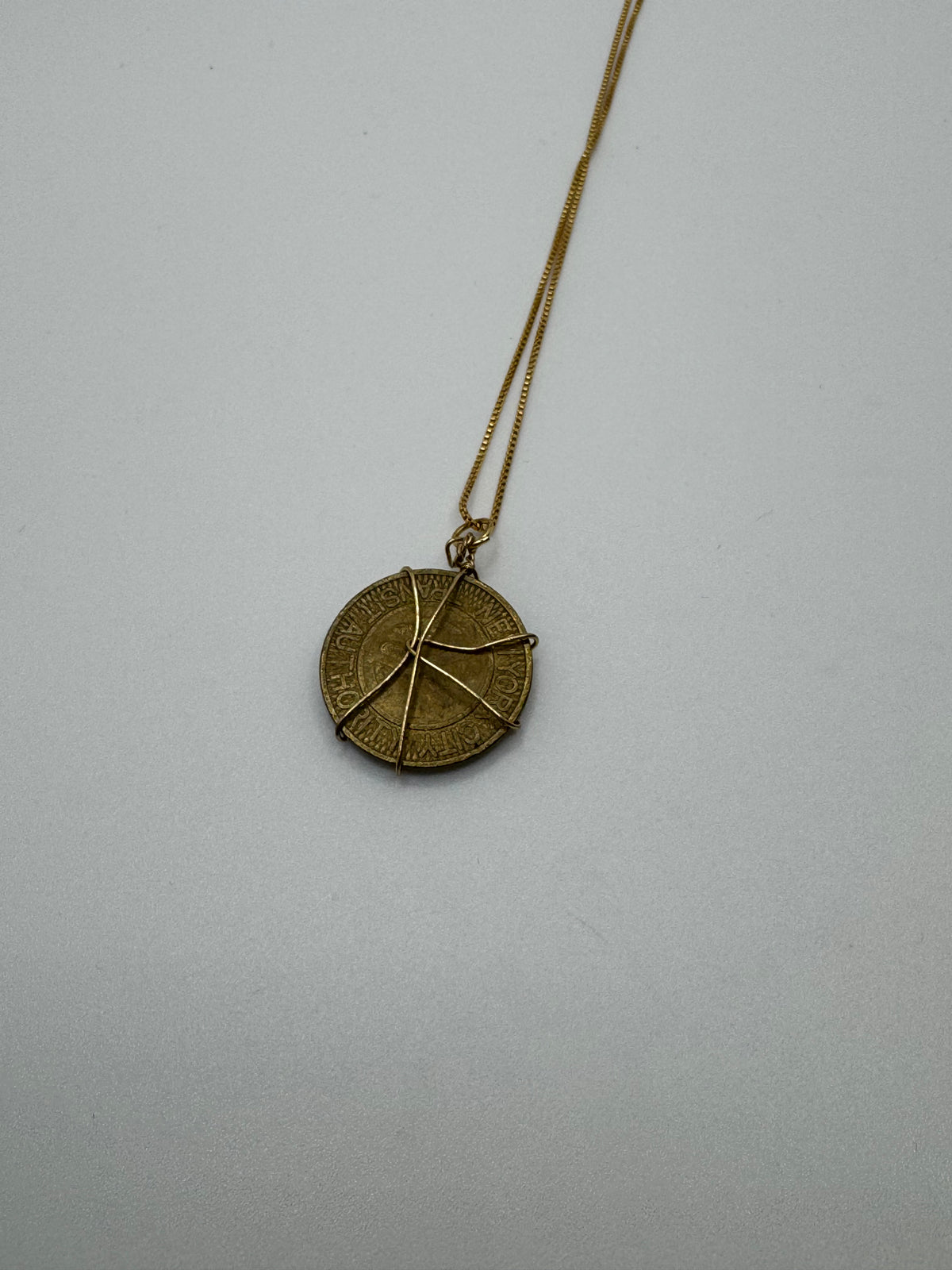 A vintage-inspired coin pendant wrapped in delicate gold wire and suspended from a long 29-inch chain. Designed to sit lower on the chest, this statement piece adds effortless interest to simple tops, knits, and dresses. The layered wire detail gives the coin an artisanal feel while keeping the look refined and wearable.