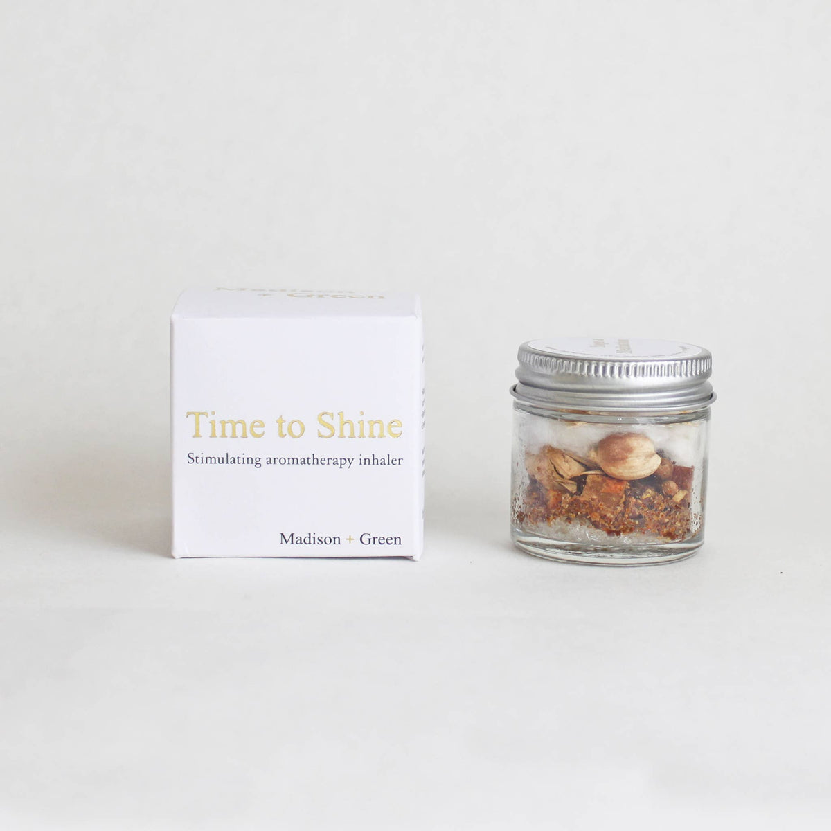A unique, stress-relieving aromatherapy inhaler for everyday use. Every jar is filled with organic essential oils, inspired by medicinal French aromatherapy, and aromatic spices inspired by traditional Chinese medicine. All oil blends are formulated by a clinical aromatherapist. "Time to Shine" Confidence Boost Inhaler - Use the inhaler before your big moment, such as a presentation, job interview, or performance. - Reduces stress related to anxiety, nervousness, and fear - Boosts confidence and positivity - Energizes, stimulates, and soothes ❃ Free gift box ❃ Lasts 3~4 months after opening Directions: Hold the jar 3~4" away from your nose, deeply inhale for 4 seconds, then slowly exhale for 6 seconds. Repeat as necessary. Ingredients: Essential oils (Lemongrass, Sweet Marjoram, Eucalyptus, Camphor), Menthol, aromatic spices 𝑽𝒆𝒈𝒂𝒏. 𝑪𝒓𝒖𝒆𝒍𝒕𝒚-𝒇𝒓𝒆𝒆. 𝑾𝒐𝒎𝒂𝒏-𝒐𝒘𝒏𝒆𝒅. 𝑴𝒂𝒅𝒆 𝒊𝒏 𝒕𝒉𝒆 𝑼𝑺𝑨.