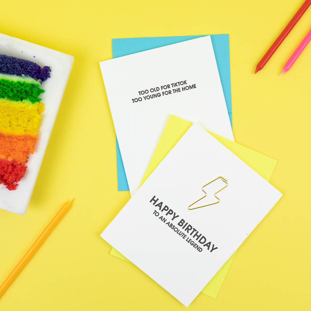 Our "Too Old For Tiktok Too Young For the Home" Birthday card is letterpress printed on a vintage printing press. Paper: Bright White, Tree-Free 100% Cotton Paper Text: Black Envelope: Neon Blue Size: 5.5" x 4.25" Folded card, blank inside Sealed in a cello sleeve